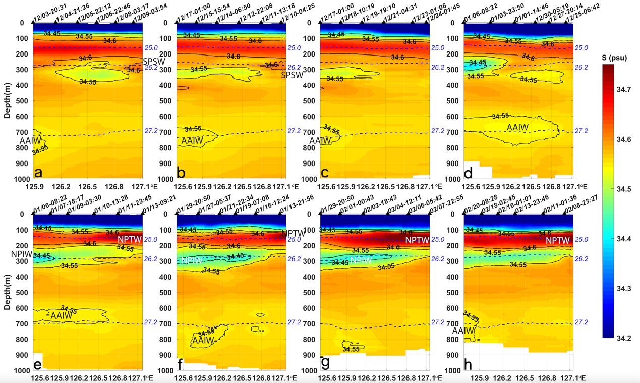 2018年至2020年,海洋所联合印尼Sam Ratulangi大学利用水下滑翔机开展了三次断面观测,收集了马鲁古海峡上层1000米的温盐剖面数据。观测数据显示,北太平洋热带水和中层水分别以130-180米和250 -300米的深度入侵马鲁古海峡,这与棉兰老岛流在马鲁古海的季节内摆动密切相关。该水团的变异特征提供了棉兰老流从塔劳岛东侧入侵马鲁古海峡的直接证据,并得到了潜标同期海流观测数据和卫星高度计数据的进一步佐证。更深的南极中层水存在于马鲁古海峡中西部600-800米之间,也具有显著的季节内变化特征,这与同期的ARGO剖面浮标观测数据一致。
