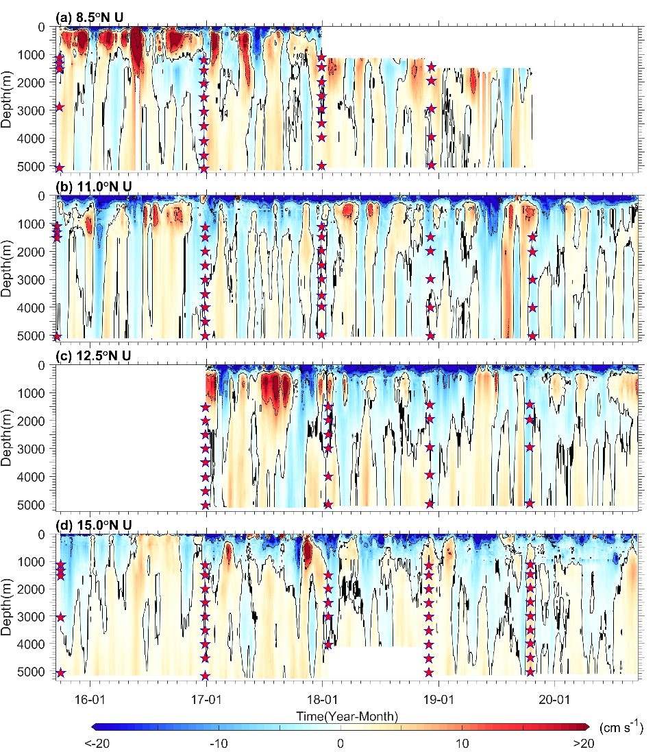 菲律宾海盆南部四个潜标点处纬向流速U的时间-深度变化图