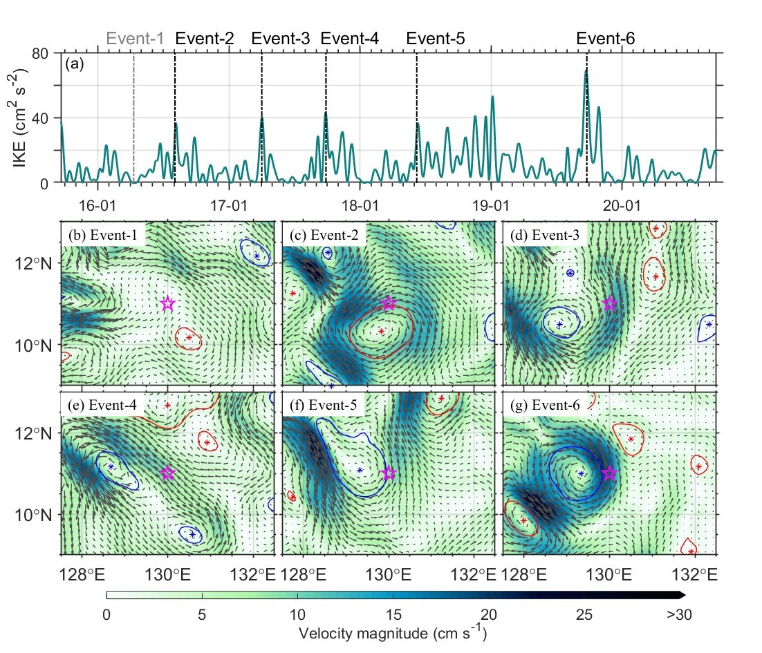 中深层流的季节内变异周期为20-120天,季节内能量在11°N最强,然后向南北两侧减小。借助高分辨率再分析数据结果,研究发现中深层季节内变异主要是由于中深层涡旋引起,当中深层涡旋经过潜标点时,季节内能量显著增加。这些中深层涡旋有些是独立于次表层涡旋存在的,有些则是次表层涡旋延伸到中深层。诱发中深层涡旋的主要因素为正压和斜压不稳定过程。该研究结果丰富了对菲律宾海盆内深层环流以及深层与上层海洋联系的认识,有助于多学科开展生物地球化学要素循环、深层水团性质和变异及气候变化等方面的研究。