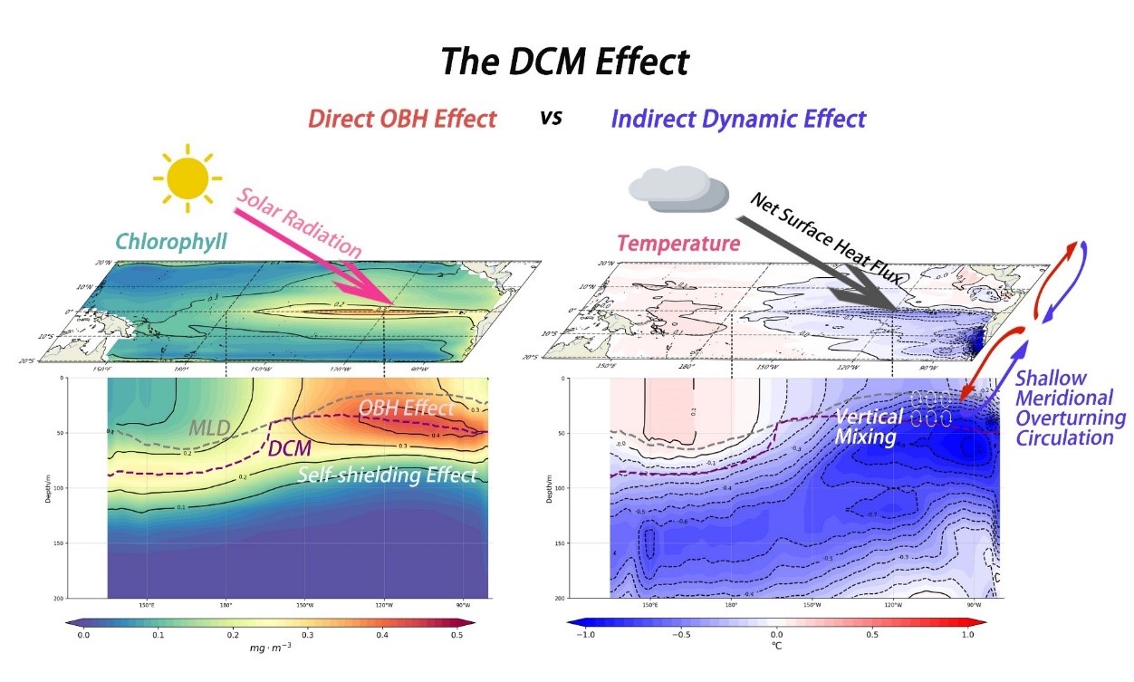 研究团队利用一个海洋环流-生态耦合模式,在给定的大气强迫下设计两组敏感性试验,探究了热带太平洋DCM气候态分布对海表温度(SST)的影响,以及DCM年际变率对厄尔尼诺-南方涛动(ENSO)振幅的影响。结果揭示DCM效应存在着两种相互抵消作用的机制:一种是海洋生物引起的直接加热(OBH)效应,另一种是与垂向混合和浅层经向翻转环流(sMOC)有关的动力过程引起的间接冷却效应。