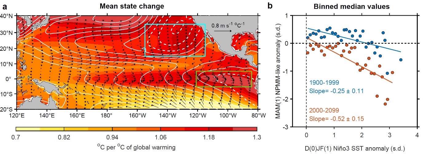 图2 (a)全球变暖后太平洋背景平均态的海温、风场及海表面气压的变化(b)全球变暖后,次年春季北太平洋经向模态对于前一年冬季热带东太平洋厄尔尼诺暖海温异常的响应增强
