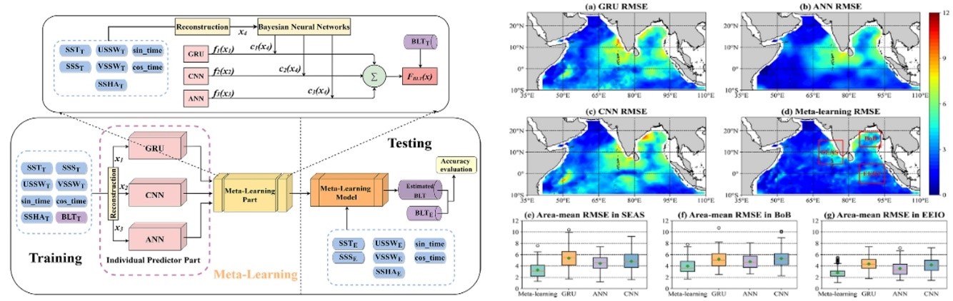 尹宝树团队采用先进的元学习技术,成功集成了卷积神经网络(CNN)、门控循环单元(GRU)和人工神经网络(ANN)三种机器学习模型,提出了一种新颖的多模型集成方法,从而显著提升了海洋障碍层结构的反演精度。通过利用海表温度(SST)、海表盐度(SSS)和海表风速(SSW)等关键海表环境要素,研究团队能够准确地重构出海洋障碍层结构。这一研究成果不仅突破了传统观测技术和数值模型的局限性,更展示了机器学习,尤其是元学习在海洋学研究中所拥有的巨大潜力和广阔应用前景。此外,该研究对于我们深入了解海洋动力学、推动海洋环境变化研究,以及应对全球气候变化均提供了宝贵的支持与贡献,具有显著的学术价值和广泛的实际应用前景。