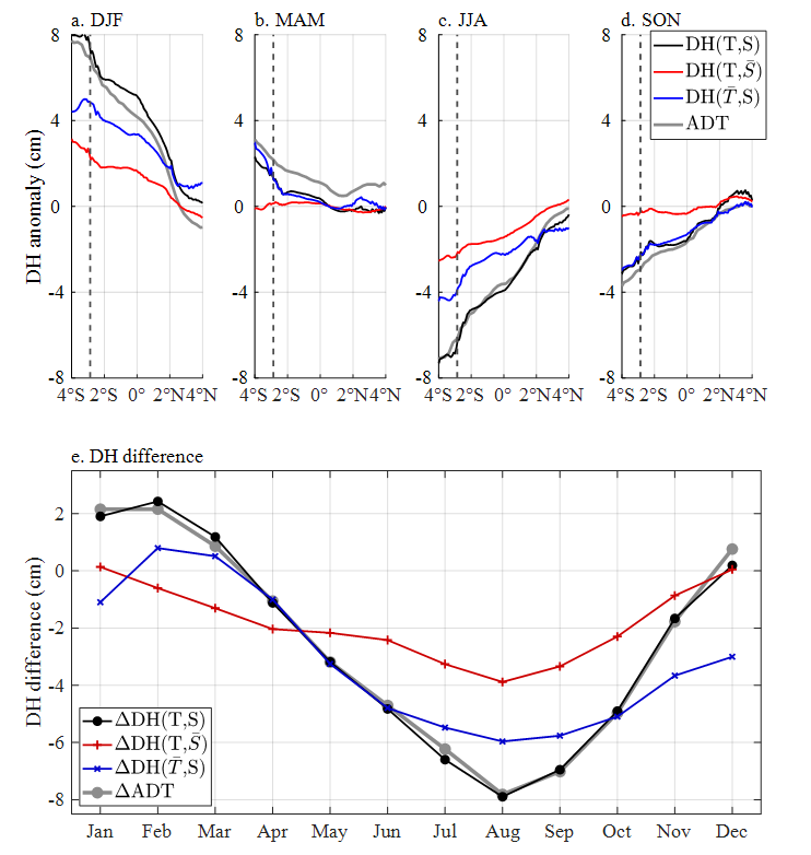 绝对动力高度、海表动力高度、热容动力高度和盐容的动力高度季节变化(a,b,c,d)和望加锡海峡南(4°S–2.8°S)北(2.8°S–2°N)差