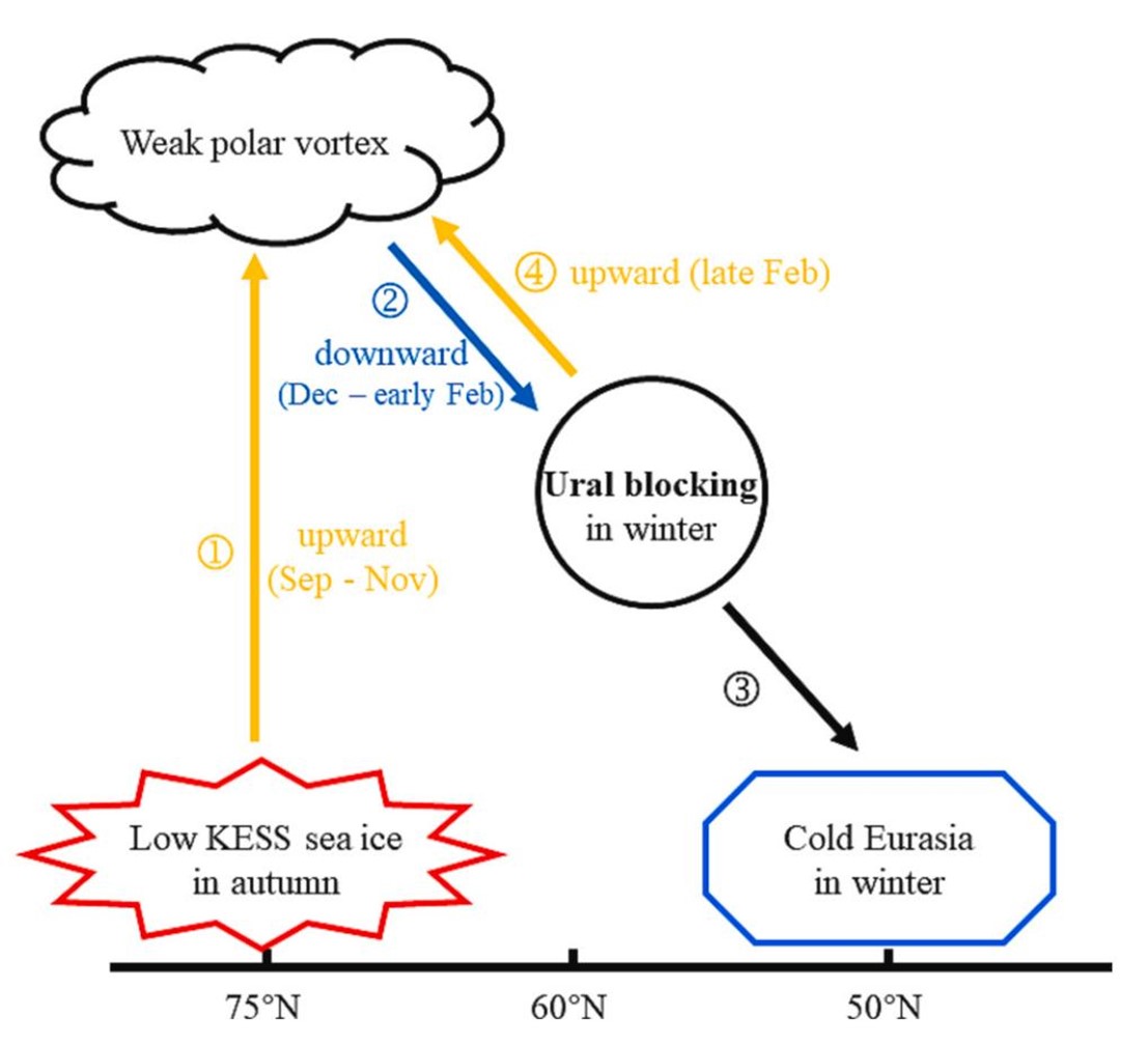 近日,中国科学院海洋研究所王凡团队联合中国科学院大气物理研究所罗德海团队在JCR一区Atmospheric Research发表最新研究成果,揭示了秋季喀拉海-东西伯利亚海(Kara-East Siberian Sea, KESS)海冰减少有利于增强冬季乌拉尔阻塞以及欧亚大陆高纬度冷异常的物理机制,为冬季欧亚大陆高纬度气温变化的季节预测提供新的理论支撑。