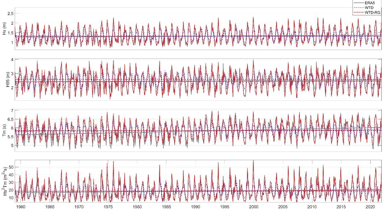 ERA5和基于天气分型的统计降尺度模型(WTD和WTD-RG)对中国近海海浪(1959-2021)特征刻画的对比:(从上到下)月平均有效波高,月极值波高,平均波周期、月平均波浪能