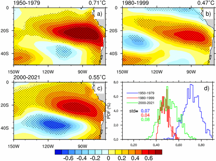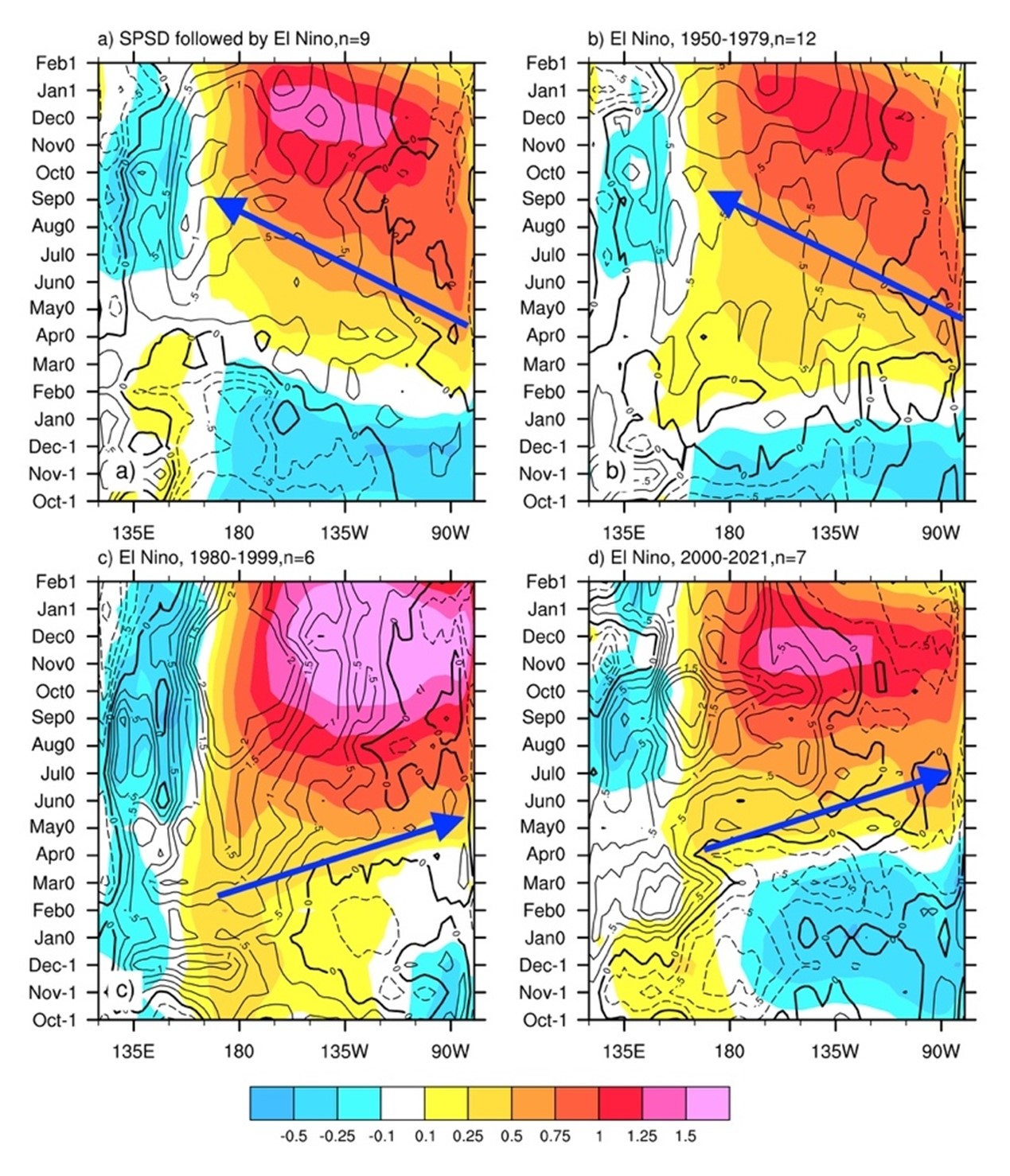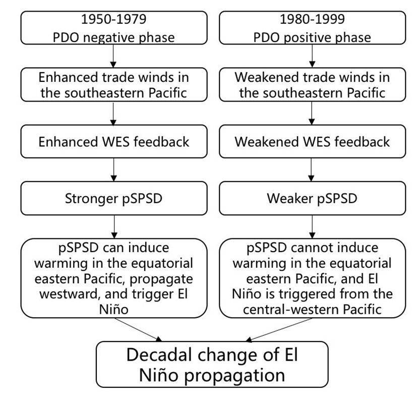 研究发现,正位相SPSD事件引起的El Nino海温异常沿赤道向西发展,这些事件主要发生在1979之前;在1980-1999期间,鲜有SPSD引发El Nino发生,该时期的El Nino主要向东发展。产生这种差异的原因与太平洋多年代际振荡(IPO)的位相转变有关:与1980-1999正处于IPO正位相相比,1950-1979为IPO负位相,副热带东南太平洋的背景东南信风更强,可以引起更强的风-蒸发-海温反馈过程(WES反馈),从而导致SPSD的海温异常更大,激发更多西传型El Nino。而在1980之后IPO正位相,SPSD强度较弱,不能激发El Nino,El Nino更多受到赤道太平洋过程的影响,向东发展。
