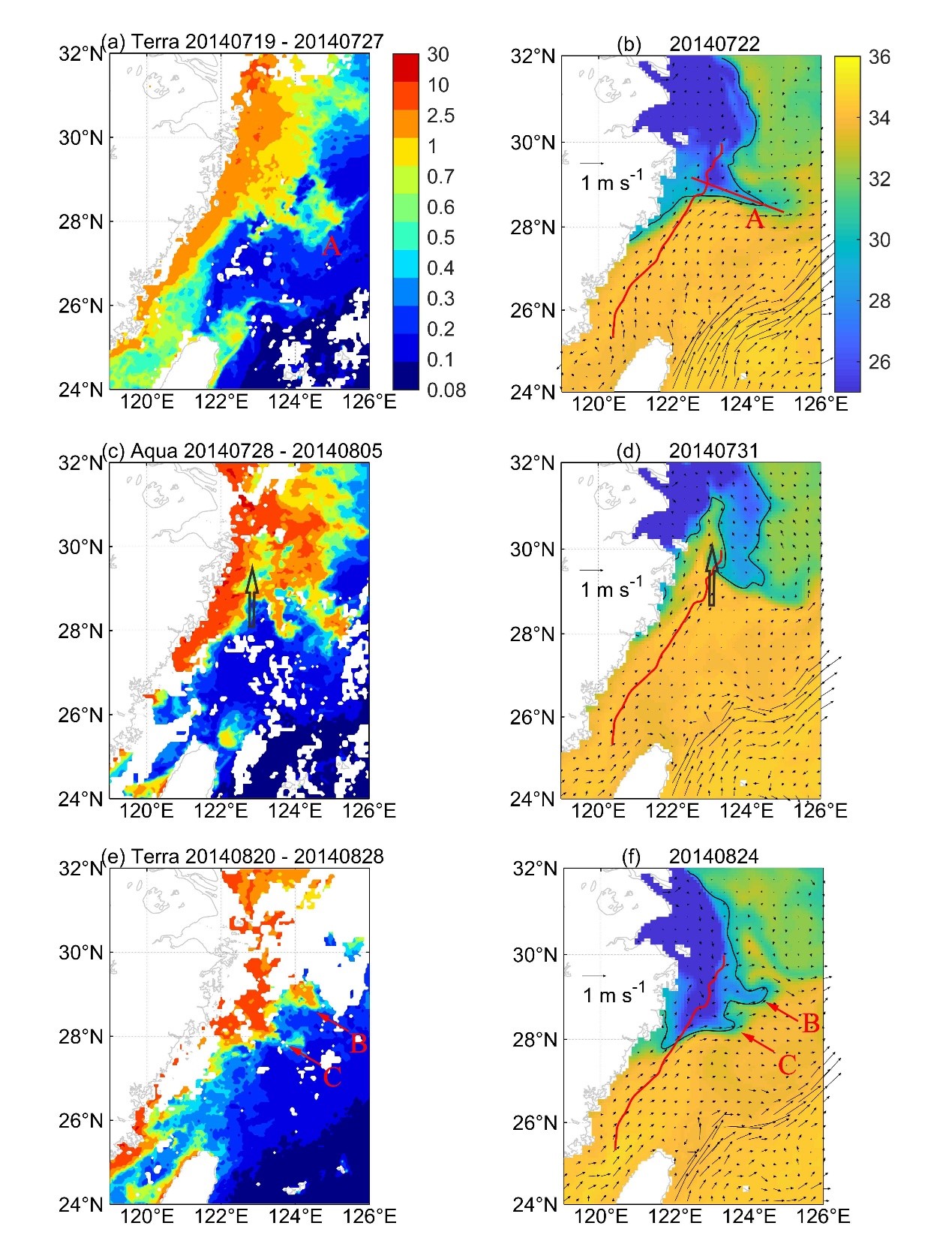图1. 卫星观测和模式模拟的跨陆架强锋面的对比。左列为卫星观测的叶绿素a浓度,右列为模式模拟的盐度和上20米平均的海流。红色箭头和字母“A-C”标注了跨陆架强锋面的位置。(c,d)中黑色空心箭头表示台湾暖流向长江口水下河谷的入侵。每个子图上标注了对应的日期。黑色等值线表示30 psu等值线。红色线表示60米等深线。