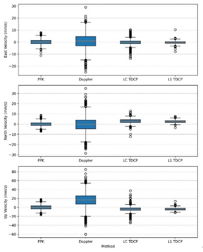 图1 利用PPK、L1 TDCP、LC TDCP和原始多普勒方法确定的NEU方向速度精度