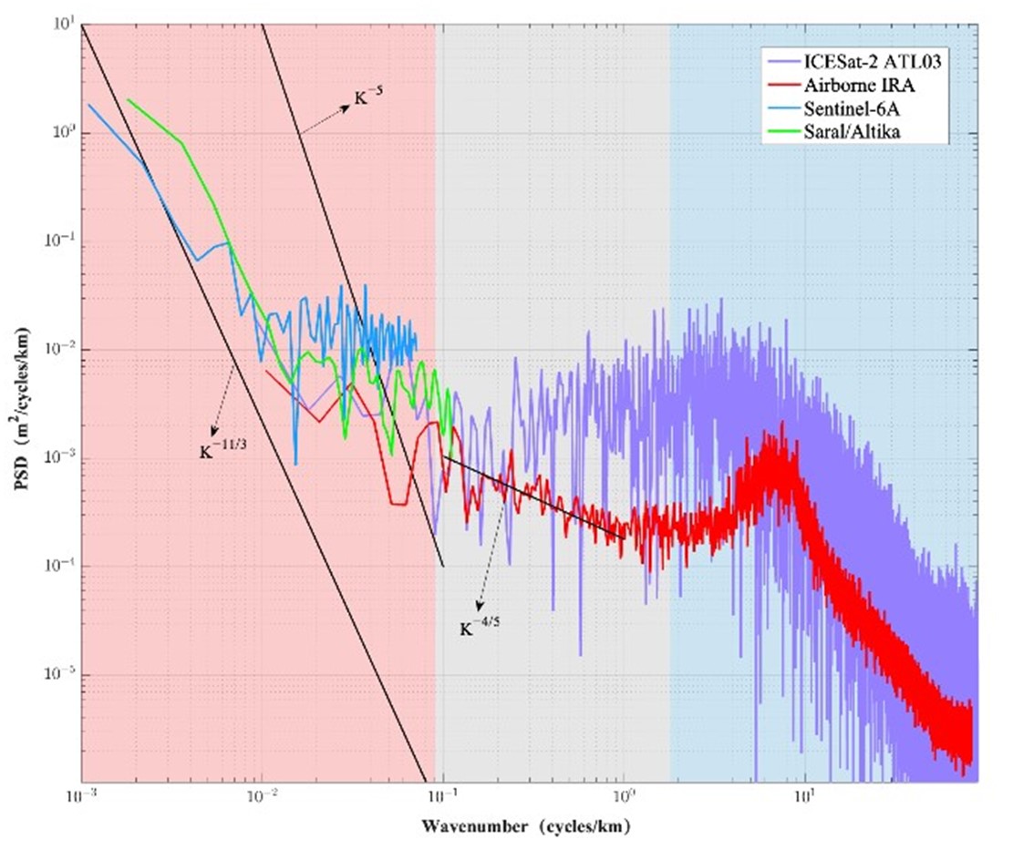 机载干涉成像高度计观测的海面高度波数谱(红色)与星载高度计ICESat-2、SARAL/AltiKa和Sentinel-6A波数谱的比较