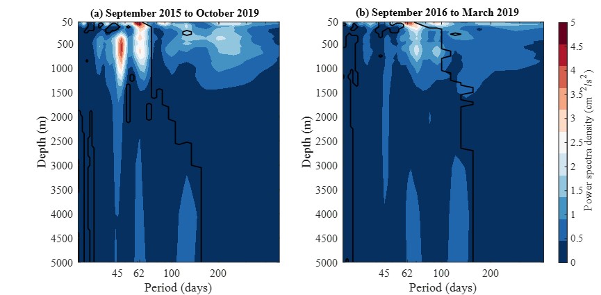 研究结果表明,菲律宾海经向流速存在两个主要的季节内变化周期分别是45天和62天,具体表现为:250–5000米的整层海流都具有显著的45天的变化,在1500米以上和2500米以下海流中可见62天的变化信号。进一步研究发现,近乎于全水深存在的45天变化和深层海洋的62天变化主要是由海盆正压罗斯贝波本征模调制,其能量来源于局地共振风场,1500米以上的62天的季节内变化受大洋第一斜压Rossby波的控制。