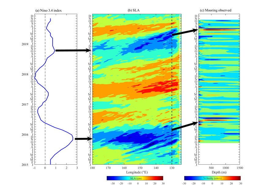此外,研究发现ENSO事件对西太平洋上层海洋季节内波动有显著调节作用,体现在2015/2016年和2018/2019年厄尔尼诺事件半年之后,在西太平洋的上层海洋分别出现了两次超强的季节内波动。