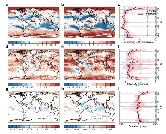 图1 21世纪末期(2071-2100)复合风雨事件(a-b)频率、(d-e)强度和(g-h)持续时间的多模式集合中值预估变化,参考期为1961-1990,第一二列分别代表SSP245和SSP585情景结果;(c, f, i)分别为频率、强度、持续时间的全球纬向平均预估变化。打点区域代表变化显著区域。