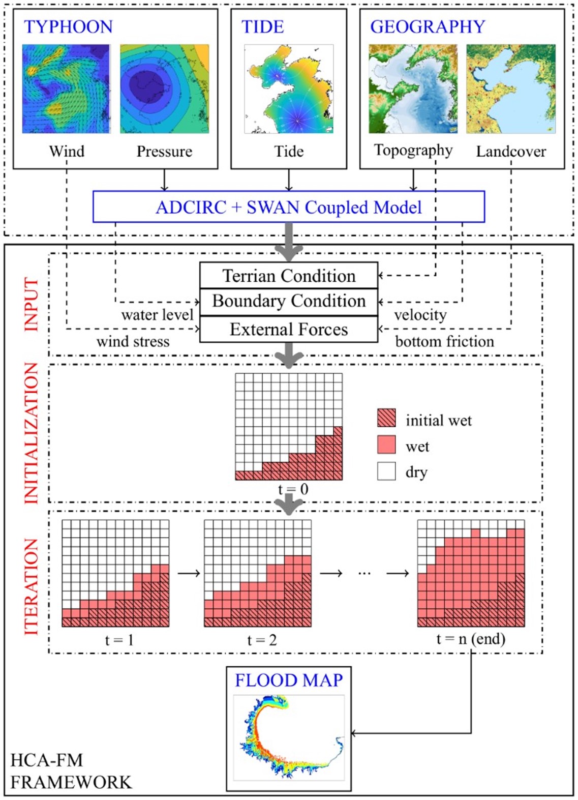 本研究创新性地构建了一个高效的风暴潮淹没模拟框架(如图1所示),该框架核心在于引入了基于浅水动量方程推导出的新型淹没动力判据,并融合了元胞自动机(Cellular Automata, CA)网格迭代算法,实现了对风暴潮导致近岸淹没过程的精准模拟。这一创新设计规避了传统数值模式中复杂的数值差分运算,从而大幅提升了模型的计算稳定性,同时简化了计算网格的构建流程,使其更易于实施。