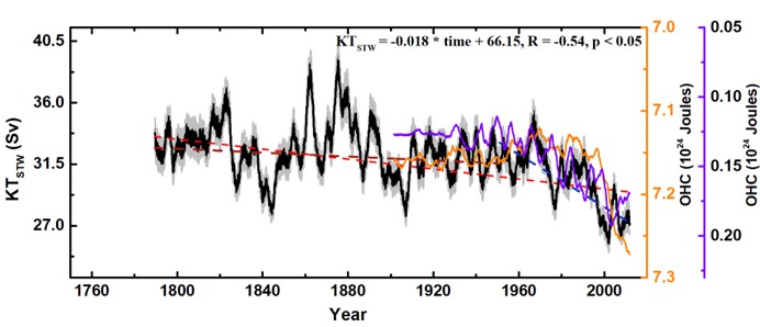 图3 珊瑚Sr/Ca重建的1788-2013年台湾东南部黑潮流量(黑线)及与全球(橙线)及西太暖池(紫线)海洋热含量关系