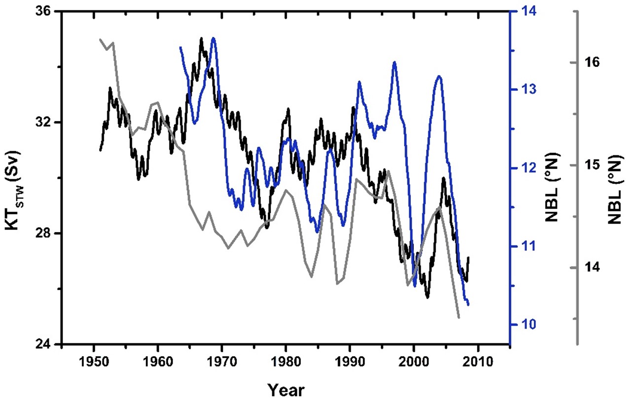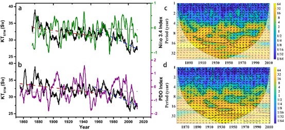 由于黑潮对西北太平洋温度有重要影响,黑潮与其路径上的海水温度之间存在密切关系,而珊瑚的Sr/Ca指标可用于定量重建海表温度变化(图1),且珊瑚具有时间尺度广、生长速度快、分辨率高、地球化学指标丰富、定年精确等特点,可以通过珊瑚Sr/Ca指标重建的海表温度变化来重建黑潮流量,以弥补器测资料的不足。为此,研究团队利用我国台湾岛南部采集的滨珊瑚样品月分辨率的Sr/Ca数据,并结合前期已发表的滨珊瑚月分辨率的δ18O数据(Li et al., 2017)进行分析。研究发现,在年际时间尺度上,增强的黑潮通过产生强烈的上升流,引起表层海水温度改变,导致珊瑚Sr/Ca增加(图2)。研究团队进而利用珊瑚Sr/Ca重建了1788-2013年的台湾东南部年际尺度黑潮流量变化(图3),发现长期以来黑潮流量具有减弱的趋势,特别是1950s后受海洋变暖影响减弱趋势加快(图3)。此外,北赤道流分岔位置的南移对黑潮流量的减弱也有一定贡献(图4)。ENSO和PDO相位的转变,特别是在1950s前,对黑潮流量的长期变化也具有一定影响(图5)。本研究为今后利用珊瑚地球化学指标记录洋流变化提供了参考,可以利用化石珊瑚示踪古洋流的变化。