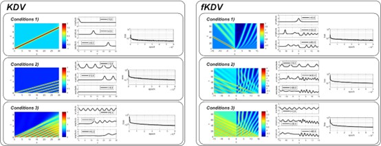 PIRBF模型非线性方程的三个初始条件下KdV(左)和fKdV(右)方程的模型结果