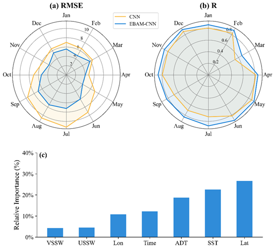 针对这一问题,研究团队通过利用海表温度(SST)、绝对动力地形(ADT)和海表风场(SSW)等关键海表环境要素,结合EN4观测数据,提出了一种基于Enhanced Block Attention Module-Convolutional Neural Network(EBAM-CNN)模型的降尺度方法,该方法能够有效利用高分辨率海表观测数据重构次表层中尺度结构特征。此外,研究团队通过SHAP可解释性算法量化了输入特征的贡献值,揭示了SST、ADT和纬度信息是影响温跃层深度的关键因子,有助于进一步理解温跃层的形成及变化机制。该研究成果为其他高分辨率次表层要素的重构提供了新的方法和思路,在海洋动力学研究和海洋环境变化分析等方面具有重要意义,具有显著的学术价值和广泛的实际应用前景。