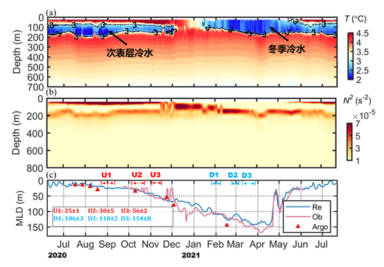 图1 (a-b)潜标观测的温度和层结 (c)潜标观测的混合层深度、再分析数据和Argo观测结果(分别对应品红色线、蓝色线和红色三角)