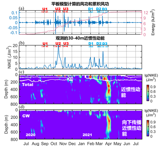 图2 (a)潜标站位点的风功(b-d)潜标观测的近惯性动能