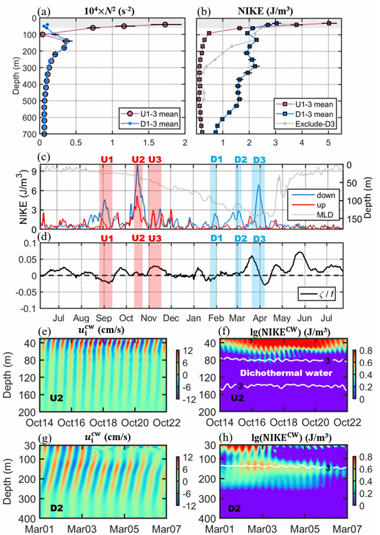 图3 (a-b)夏季和冬季风生近惯性事件发生期间层结平均和近惯性动能平均剖面(c)旋转分解近惯性流速计算的近惯性动能(红色为向上传播能量,蓝色为向下传播能量)(d)相对涡度 (e-h)U2和D2事件发生期间的顺时针近惯性流速和近惯性动能