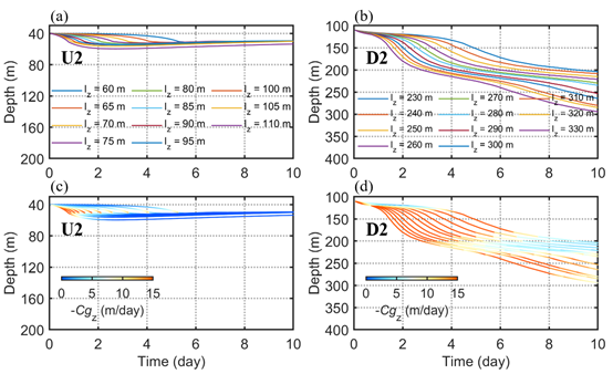 由于U2和D2期间的涡度几乎为0,表明这两次事件几乎不受涡旋的影响,可用这两次事件比较混合层深度差异对其能量传播深度影响。图4是针对U2和D2事件开展的射线追踪分析,结果显示夏季期间混合层深度浅,形成小的垂直波长,群速度几乎为0,能量被限制在近表层。而冬季混合层深,形成大的垂直波长,群速度快,能量向深层传播。因此,混合层深度影响近惯性内波的垂直波长,从而塑造近惯性能量的传播深度。
