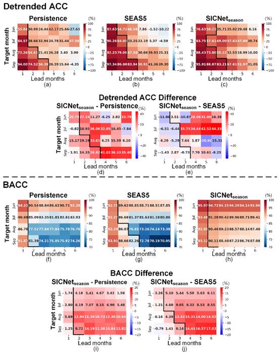 图1 SICNetseason与季节预测模式SEAS5和Persistence相比,显著改善春季预测障碍。以9月为目标,去趋势的海冰边界异常相关系数(Detrended ACC),在提前4~5个月的预测中,SICNetseason相比SEAS5提升7%~10%(e),BACC精度提升明显(j)