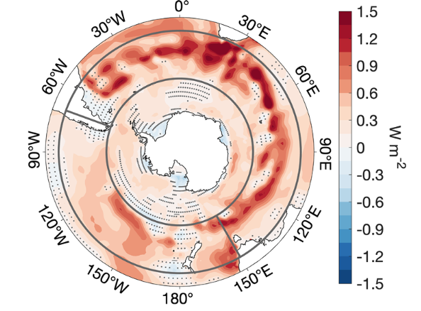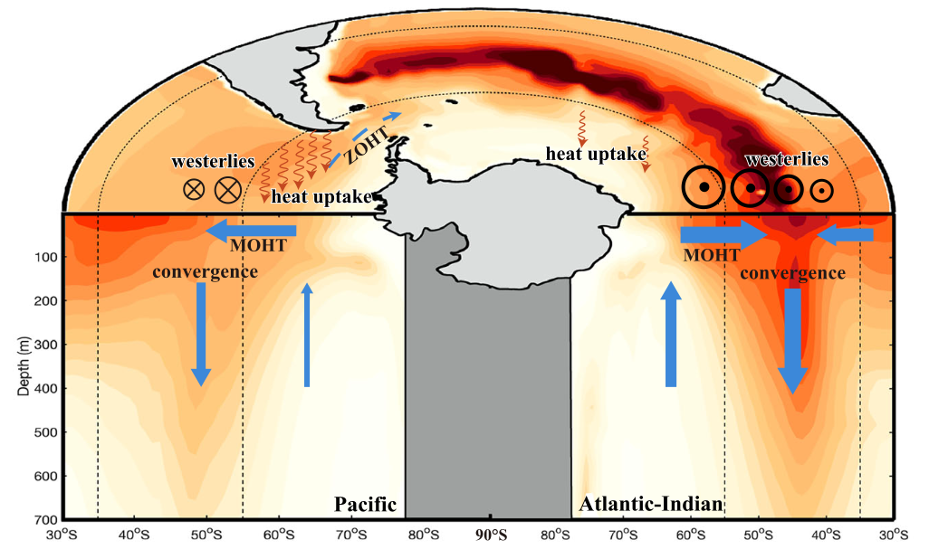 自20世纪中期以来,地球系统因温室气体累积而吸收的多余热量超过90%被储存在海洋中。其中,南大洋(Southern Ocean)对全球海洋热储的贡献达60%,是全球气候系统变化的“热量阀门”。它的持续变暖不仅影响南极冰架融化、全球海平面上升,还深刻改变深层水体形成、海洋碳吸收能力与海洋生态系统。过去的研究普遍采用纬向平均的方法,描绘出南大洋以45°S为中心的经向(南北向)升温结构:靠近南极的高纬海区吸热后,热量被风驱动的经向流输送至中纬度海区。但南大洋增暖的纬向结构仍不清楚。