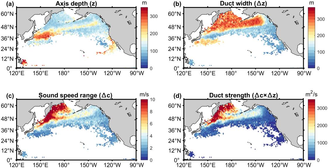 Anqi Xu, Fei Yu*, Feng Nan, Xinyuan Diao. Different types of subsurface acoustic ducts in the North Pacific. The Journal of the Acoustical Society of America. 158.4 (2025): 3048-3062. https://doi.org/10.1121/10.0039545