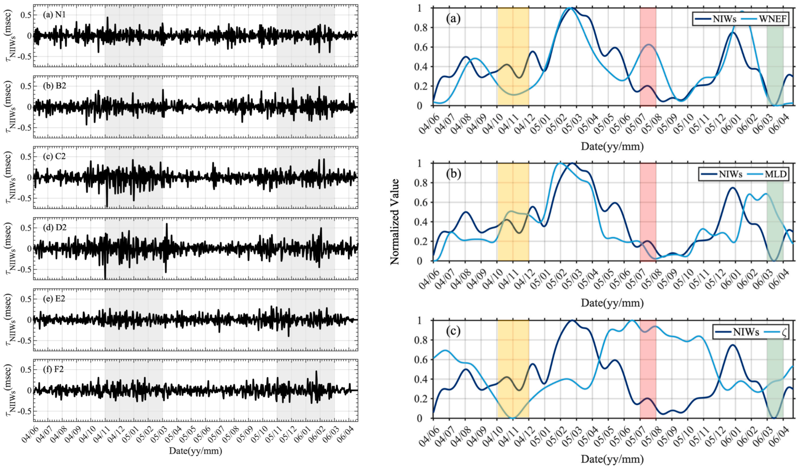 PIES观测到的近惯性振荡内波(NIWs)幅度变化(左);PIES阵列区域NIWs与WNEF、MLD和ξ之间的关系(右)