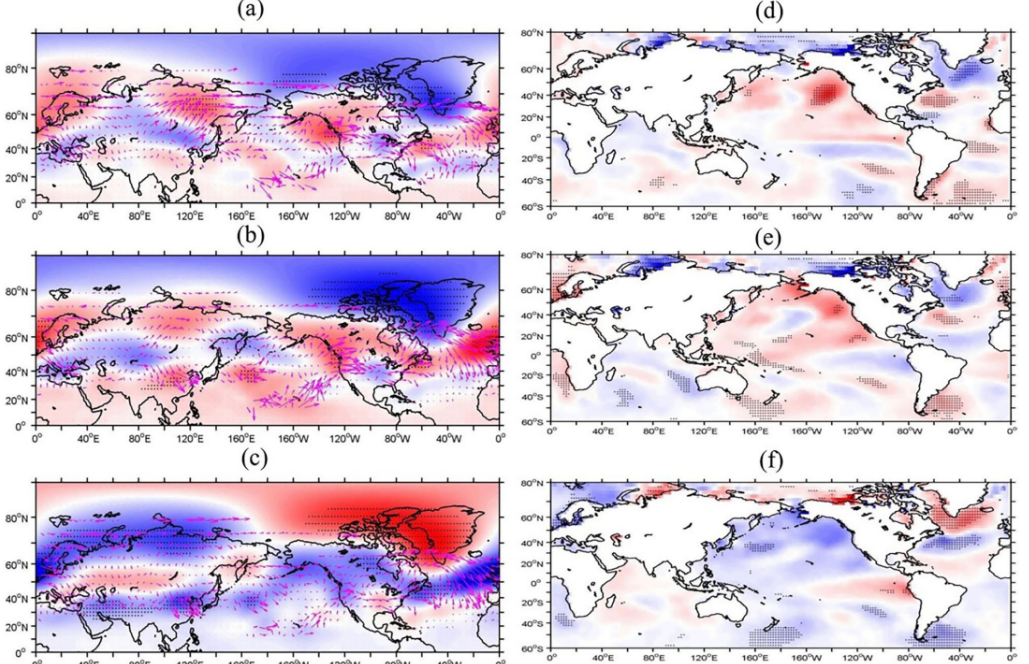 另一重要研究指出,近年来北太平洋海温升高通过激发罗斯贝波列影响北极大气环流(图4),减缓了北极夏季海冰的减少趋势(Yu et al., 2025, CEE),体现了北太平洋—北极跨区域气候关联的重要调节作用。