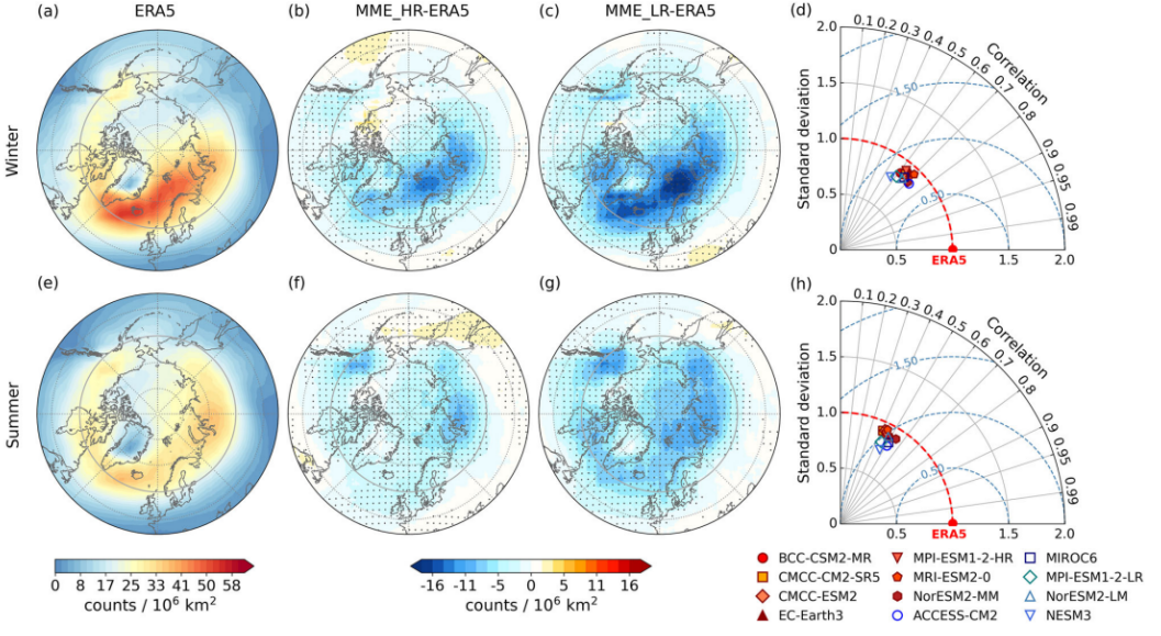 此外,研究团队与中国海洋大学陈显尧教授团队合作,在北极极端天气及其对海冰影响方面亦取得系列进展。基于MOSAiC观测与多模型分析,研究揭示了天气尺度上气旋对海冰变化的影响机制:气旋引起的动力过程(冰变形与辐散)对海冰厚度变化的贡献(日均4.14 cm)远高于热力过程(日均0.45 cm),动力过程的贡献占比可达84%(Liang et al., 2025,JC)。基于CMIP6模型的未来预估表明(图5),北极气旋活动整体呈减弱趋势,但存在季节与区域差异:冬季气旋减少主要源于副极地北大西洋本地生成的减弱,夏季则与中纬度气旋北侵减少有关。这些认识深化了对气旋–海冰耦合过程的理解,为北极气候变化的预测提供了关键依据(Chen et al., 2026, npj-CAS)。