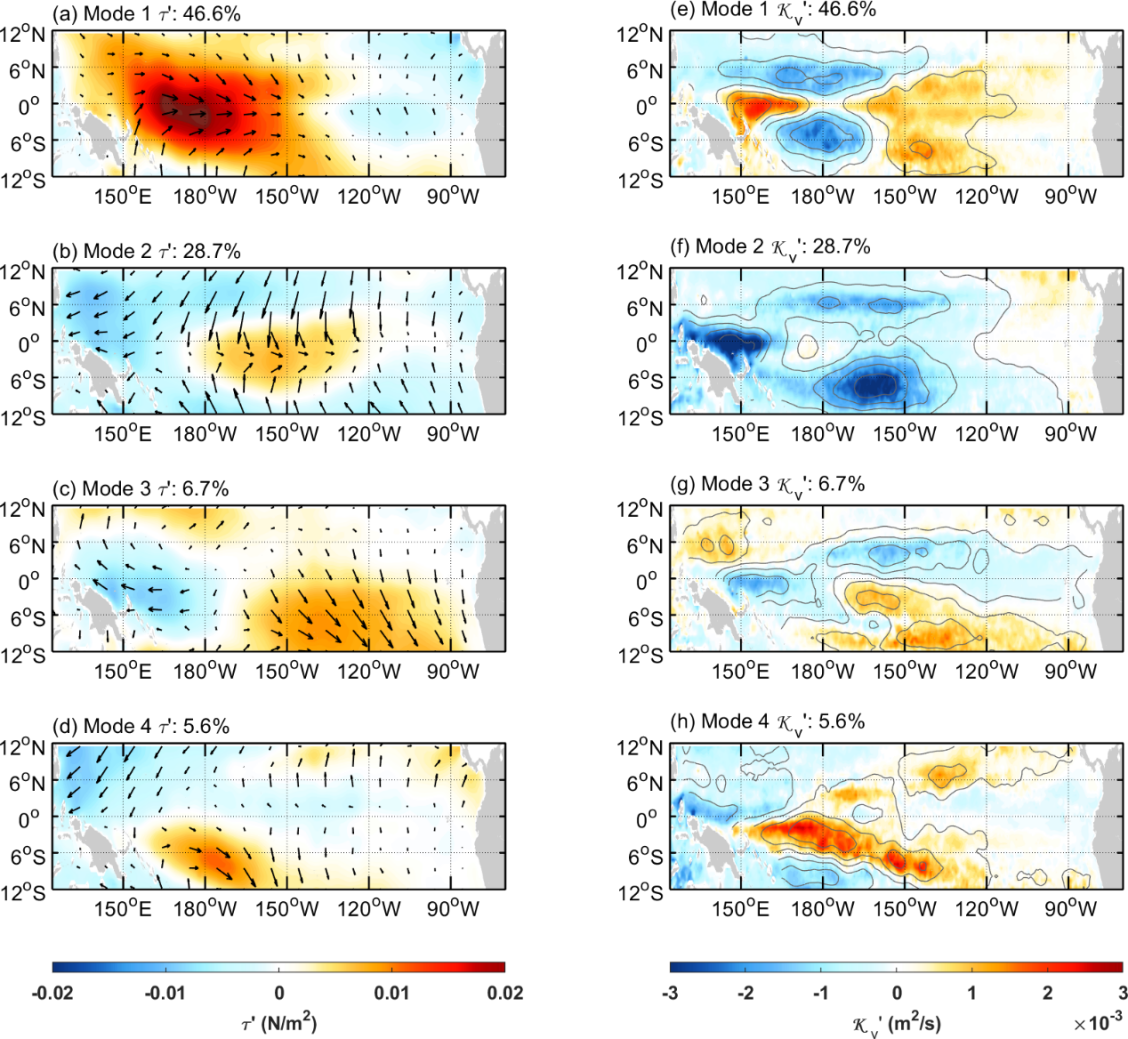 厄尔尼诺-南方涛动(ENSO)是地球气候系统中最强的年际变率信号,对全球天气有重大影响。近数十年来,科学家观测到ENSO相关海表温度异常信号(SSTA)的中心出现在中部太平洋的频次增加(而非传统的东部),且整体强度有减弱趋势,其原因仍不清晰。在以往多数气候模型中,海洋次表层的湍流混合强度常被设为一个固定值。但实际观测表明,它是随时间和空间剧烈变化的。研究团队首次利用长达40年的高分辨率MITgcm模拟数据,揭示了这种混合与海表风场之间的强耦合关系,并成功构建了其随海表风应力而变化的统计经验模型(图1)。