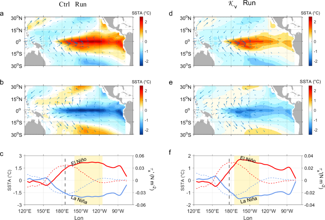 近日,中国科学院海洋研究所海洋中小尺度动力学研究组联合美国夏威夷大学与南京信息工程大学科研团队,发现热带太平洋次表层的湍流混合,是导致类“中部型”厄尔尼诺-南方涛动事件(CP-like ENSO)更加频繁、强度减弱的关键机制之一。通过将这一物理过程纳入海气耦合数值模式,显著提升了模式对CP-like ENSO的模拟能力,为更准确预测这一全球性气候现象提供了新思路。相关研究论文发表于国际期刊Journal of Climate。