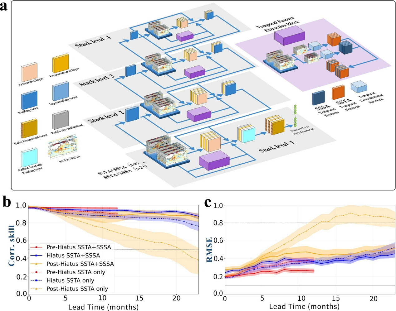 本研究基于团队自主研发的可解释深度学习模型STPNet(图1),系统评估了海表盐度(SSS)对不同气候背景下ENSO预测能力的影响。结果表明,在“停滞期”后纳入盐度信息,可显著提升ENSO预测技巧,暗示盐度已成为当前气候背景下调控ENSO可预报性的关键因子。