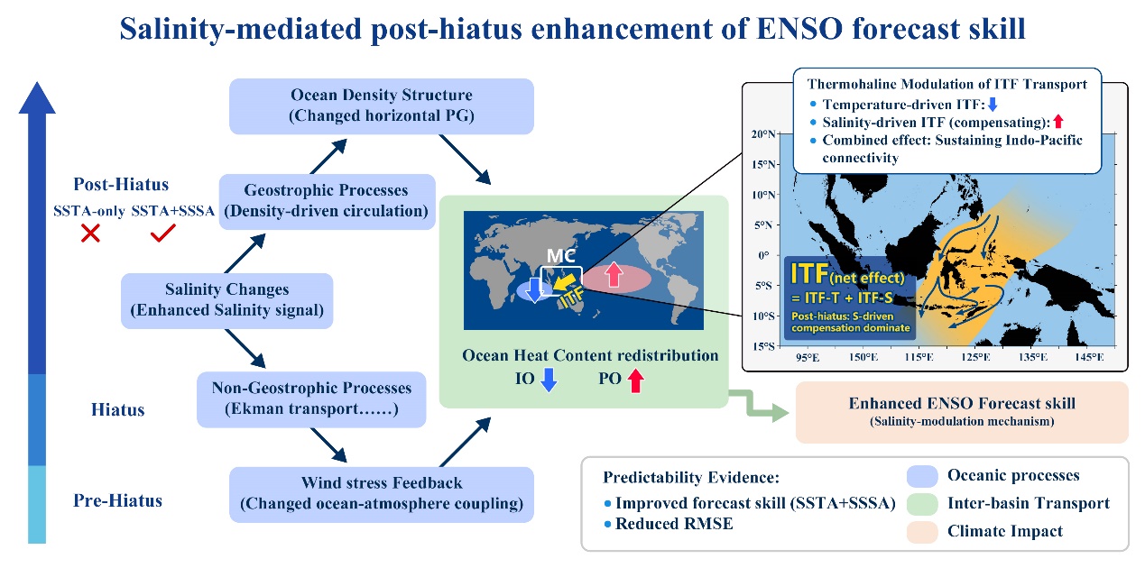 滞后相关分析进一步揭示,在停滞期之后,盐度驱动的ITF输运由原先的被动响应转变为ENSO的前兆信号(提前约3~9个月),表明盐度通过调控跨海盆输运过程,建立了一条新的ENSO前兆动力通道。该研究表明,在全球变暖背景下,ENSO预测机制正由传统的“温度主导”向“热盐耦合”机制转变,印太相互作用的重要性显著增强。相关成果不仅深化了对ENSO可预报性变化的认识,也为发展新一代气候预测系统提供了重要科学依据。