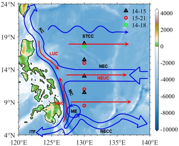 近日,中科院海洋所胡敦欣院士团队基于多年潜标连续观测,揭示了太平洋北赤道流与北赤道潜流的年际变异规律,阐明了北赤道流与北赤道潜流年际变异的经向滞后现象以及年际变异信号垂直结构的经向差异,相关成果在Frontiers in Marine S...