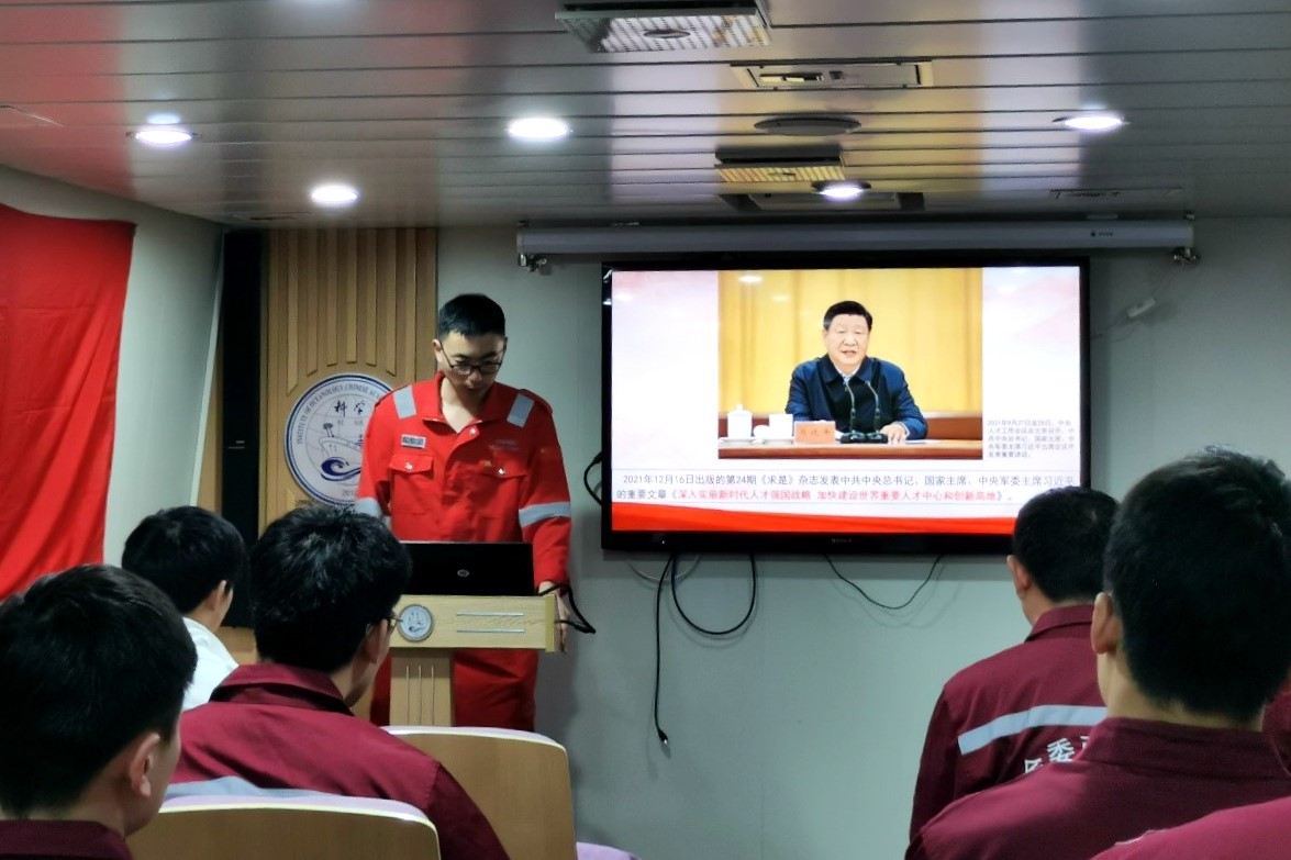 张林林同志对本航次前半段科考任务完成情况进行了简要总结,对党员在航次任务执行中的先锋模范作用表示充分肯定,切实发挥了临时党支部在科考工作中的战斗堡垒作用。临时党支部宣传委员陶泽丹同志组织与会人员学习习近平同志在中央人才工作会议中的重要讲话《深入实施新时代人才强国战略加快建设世界重要人才中心和创新高地》。