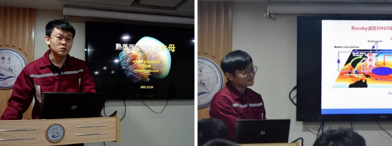 集中学习结束后,科考队员王朋鹏同志作了海洋生物方向学术交流报告《熟悉又陌生的水母》,对水母基本知识、水母暴发对海洋生态环境的影响以及如何预防水母暴发等问题进行了介绍。科考队员惠玉超同志作了物理海洋方向学术交流报告《海洋中的大尺度波动-Rossby波》,就Rossby波在ENSO循环中的作用以及ENSO之后出现拉尼娜现场的原因进行了分析与讲解。