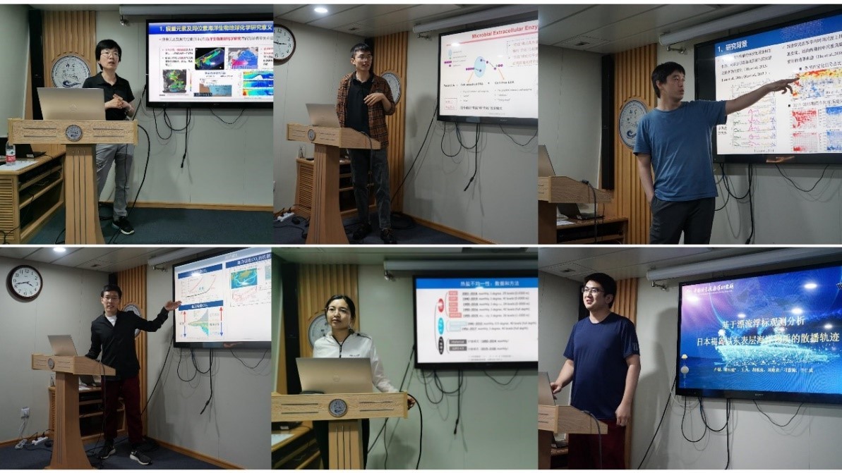 中国海洋大学教授任景玲作了题为“痕量元素洁净样品采集与分析数据质量控制”的特邀报告,深入浅出地介绍了海洋痕量元素观测研究史,强调了洁净样品采集和数据质量控制的极端重要性,详细展示了张经院士团队研发的痕量元素采集新设备及其在本航次的海试情况。来自厦门大学的朱义族生动介绍了“海洋微生物‘吃饭’的家伙——胞外水解酶”;山东大学李成龙展示了在西太平洋碳汇与酸化方面的研究进展,介绍了海洋环流与碳汇交叉方面的研究现状;来自中国科学院海洋研究所的马杰、任秋萍、卢锡分别介绍了“基于潜标阵列观测的源地黑潮与吕宋潜流结构和变化研究”“在全球海洋热盐不均一性变化趋势方面的研究结果”“从漂流浮标观测分析的角度展示了日本福岛以东表层海洋物质的散播轨迹,细致讨论了未来日本排放核废水的扩散路径和过程”。报告引起了船队员的极大兴趣,并展开热烈而深入的讨论,取得积极反响。