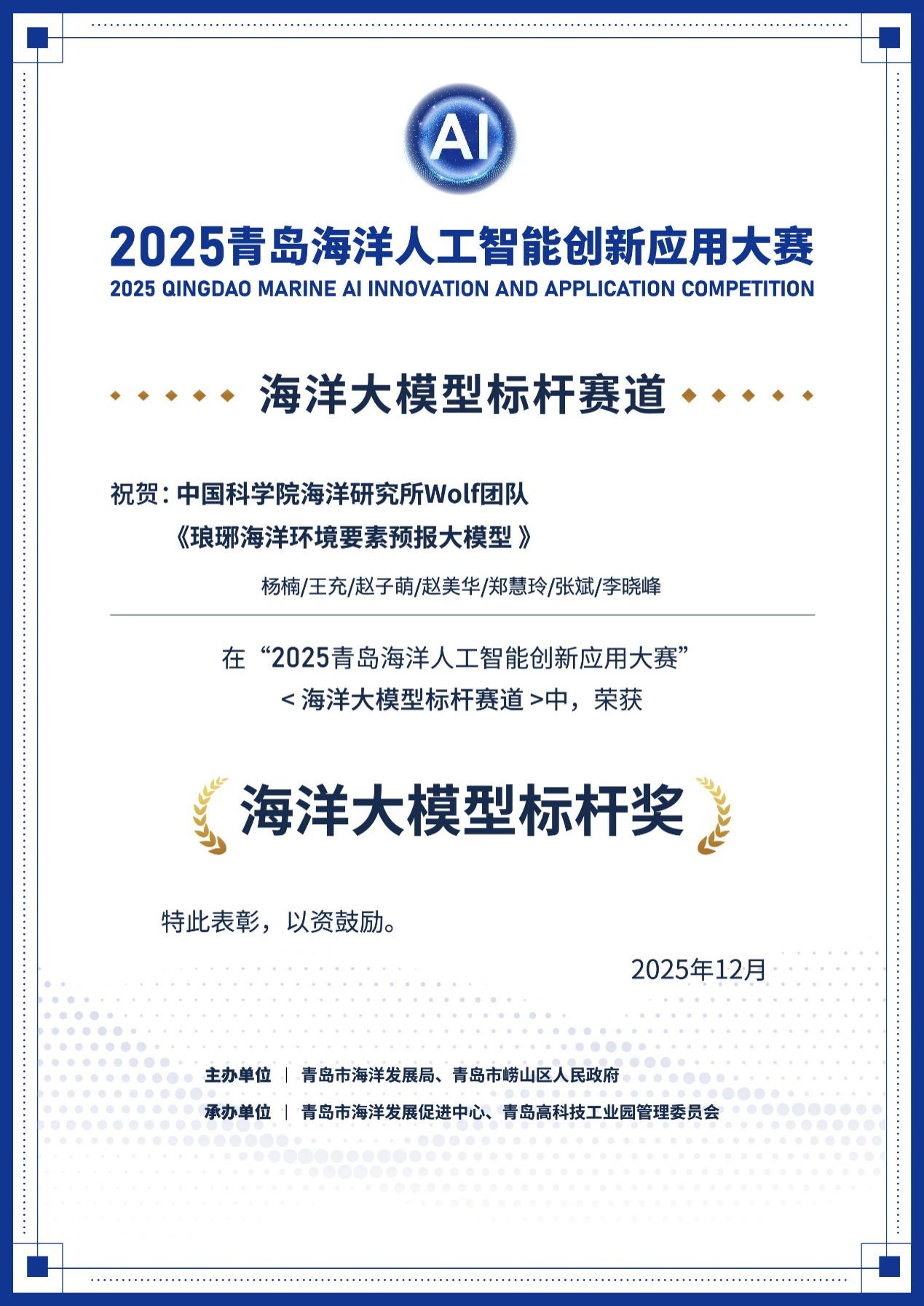近日,中国科学院海洋研究所人工智能海洋学研究组研发的“琅琊海洋环境要素预报大模型”在“2025青岛海洋人工智能创新应用大赛(2025 Qingdao Marine AI Innovation and Application Competition)”海洋大模型标杆赛道中荣获“海洋大模型标杆奖”。