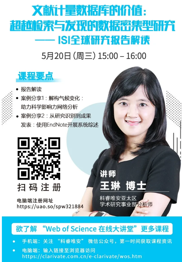 5月20日(周三)15:00 - 16:00,科睿唯安亚太区学术研究事业部分析师王琳博士将为您带来信息分析运用模块专场课程“文献计量数据库的价值:超越检索与发现的数据密集型研究——ISI全球研究报告解读”。内容精彩,敬请报名参加!