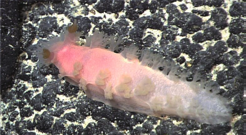 海洋所三歧海牛是首次在西太平洋发现的深海海蛞蝓,隶属腹足纲、裸鳃目、三歧海牛科。2019年发现于西太平洋卡罗琳海山970-1262m深的岩石上,体长达12cm,通体呈粉红色,以珊瑚为食。