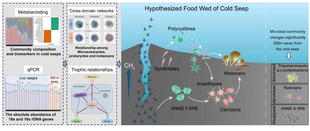 冷泉是深海中重要的生态系统,孕育了极其特殊的生物群落。高丰度的化能自养细菌和古菌,可利用甲烷和硫化氢生产有机物,哺育着丰富的无脊椎动物。但原核生物和无脊椎动物无法形成完整的食物网,缺失了重要的一环:真核微生物。目前有关冷泉中真核微生物研究极为欠缺,仅描述了基本群落构成,哪些真核微生物参与到了冷泉食物网?发挥着何种作用?仍不清楚。