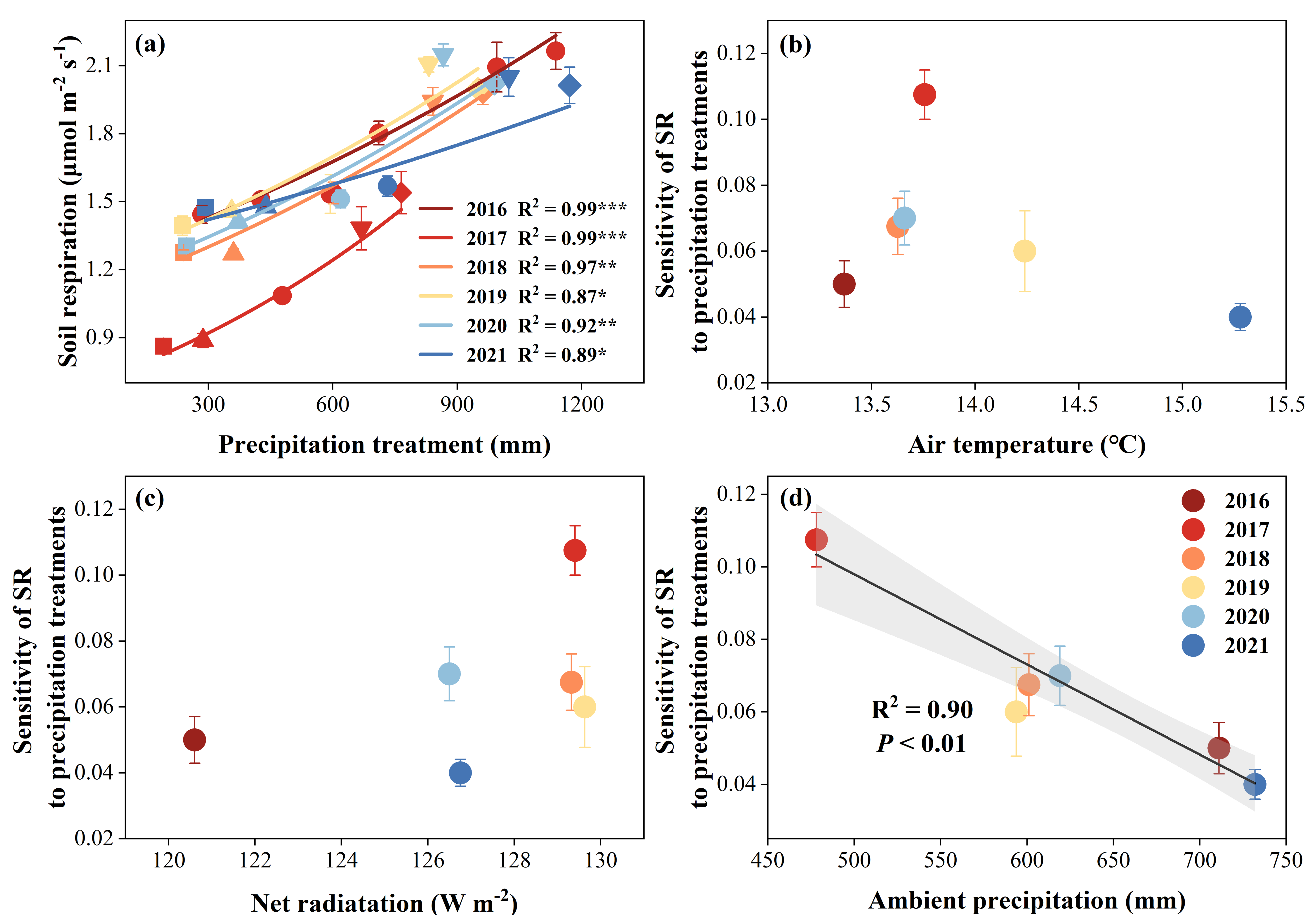 图1 2016-2021年不同降雨处理下的土壤呼吸和年降雨量之间的指数回归(a),以及土壤呼吸对降雨处理敏感性与气温(b)、净辐射(c)和降雨(c)的关系
