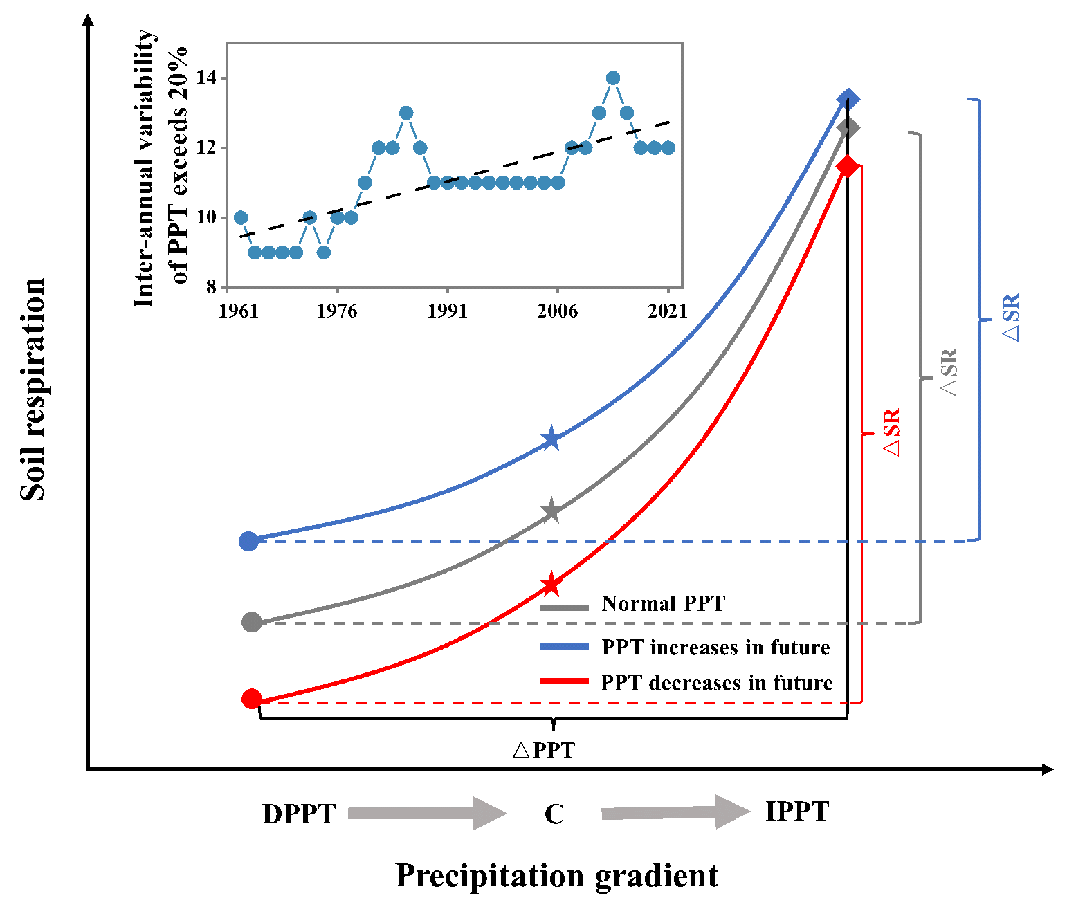 图2 预测未来土壤呼吸(△SR)随降雨(△PPT)梯度变化的概念模型
