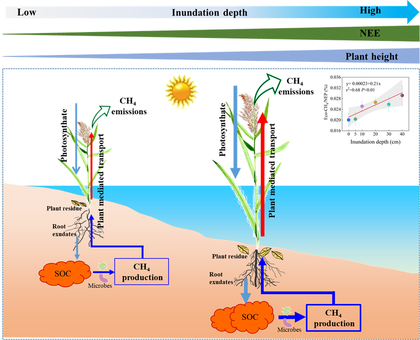 依托野外原位淹水深度控制试验平台(0、5、10、20、30和40cm淹水深度),通过滨海湿地土壤CH4排放、总生态系统CH4排放、净生态系统CO2交换和植物性状等长期定位监测,揭示了淹水深度对植物介导的CH4排放的影响。研究发现淹水深度减少了土壤CH4排放,但增加了总生态系统CH4排放(图3)。在不同淹水深度条件下,植物介导的CH4排放占总生态系统CH4排放的99%。另外,淹水深度(0至20cm)强烈的刺激了植物介导的CH4排放。一方面,增加的净生态系统CO2交换促进了植物介导的CH4产生,这可能是因为来自光合输入的碳为产甲烷菌提供了能量和碳源。另一方面,植物高度与植物介导的CH4排放显著相关,这表明植物性状在CH4传输过程中起着重要作用(Zhao et al. 2023, Functional Ecology)。该研究强调了水文状况和植物性状在未来预测湿地生态系统CH4排放中的重要性。