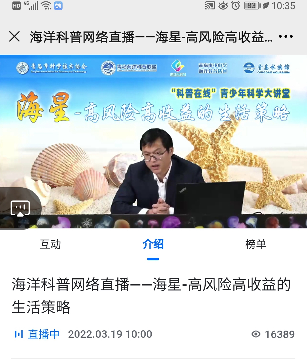 在2022年3月19日上午,我站张光涛研究员在“科普在线”青少年科学大讲堂上做了一场关于“海星——高风险高收益的生活策略”专题直播课程。课程吸引了广大中小学生和市民1万6千余人在线收看,张博士从种群生态学、生境变化等方面带领大家一起了解海星暴发的奥秘,认识海星对海洋环境和资源的危害,共同探讨如何打赢与海星的海洋资源“保卫战”。本场直播引导青少年进一步关心海洋、认识海洋、热爱海洋,不断提升海洋科学素质,助力全国海洋教育示范城特色市建设。