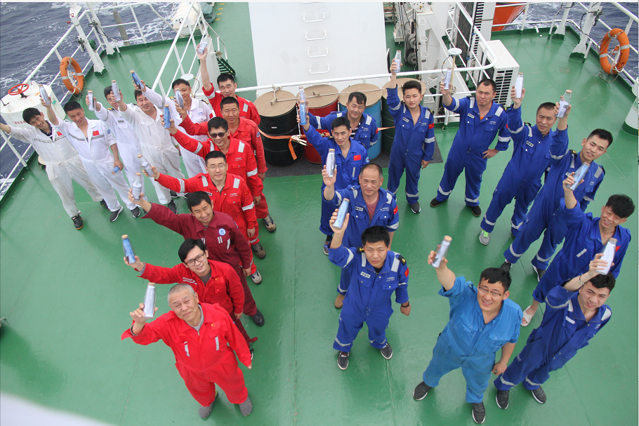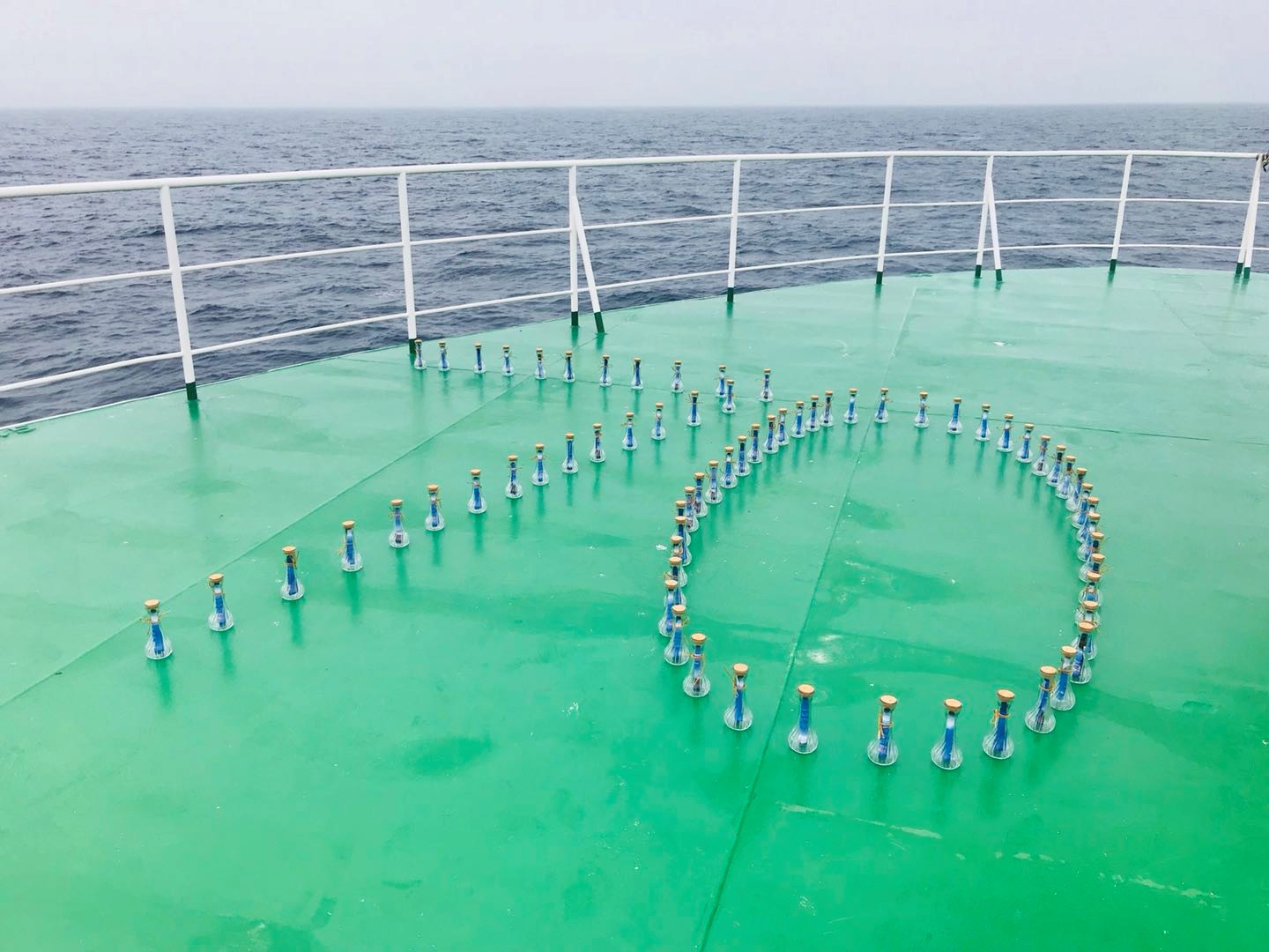 全体船队员将70个漂流瓶在科考船前甲板摆出70的字样,以庆祝海洋所成立70周年。每人拿起一个漂流瓶投放进大海,一个瓶子是一份寄托,也是对海洋所成立70年的一份祝福。这些漂流瓶中装有海洋所创新发展70年的相关介绍,它们将随着洋流飘向世界各地,希望捡到漂流瓶的朋友们能够与我们一起,共同感受海洋所“七十载耕海探洋初心不改,几代人唯实求真砥砺前行”的精神,为海洋所的改革创新发展加油祝福。
