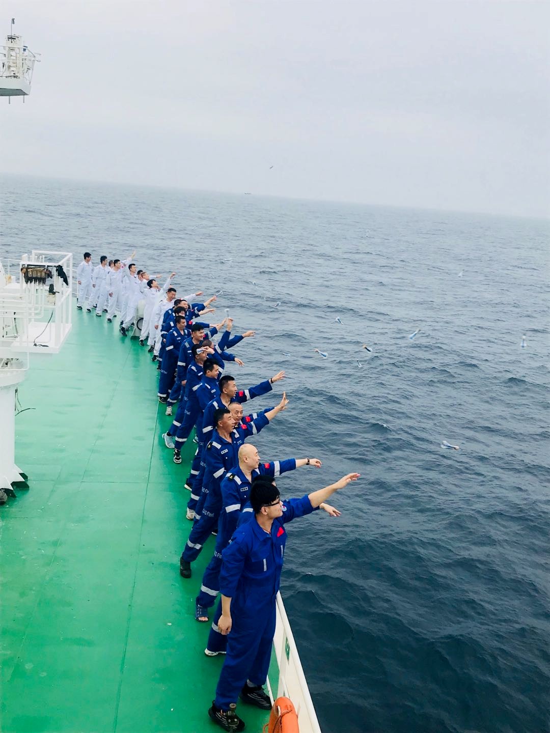 为庆祝海洋所建所70周年,“科学”号及“科学三号”在海上执行科考任务期间举行爱心漂流瓶投放活动。