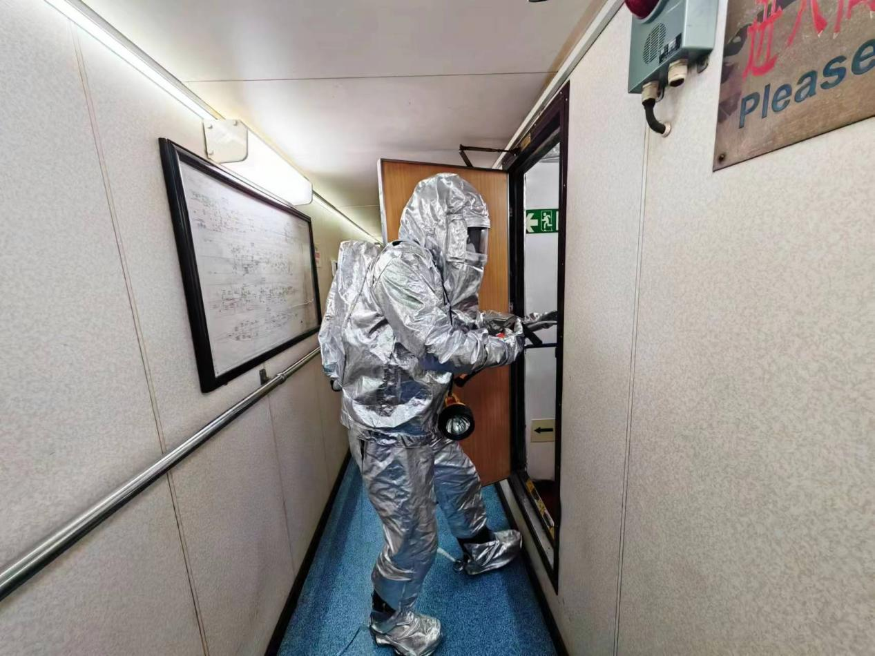 培训结束后,针对船舶机舱火灾风险高、灭火困难、全损率高等特点,立即组织开展救生消防演习。演习模拟船舶在码头靠泊期间机舱锅炉发生火灾的紧急情况。在演习中,船员们按照预应急预案有序地进行了查看火情、较小火情灭火行动,中等火势灭火行动,火势太大无法控制人员疏散、释放大型二氧化碳系统等操作,整个演习过程紧张有序,全船人员各司其职,行动迅速,动作规范。在全船的共同努力下,人员安全撤离,火势被成功扑灭,演习达到了预期的效果。